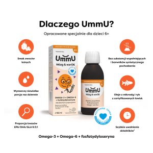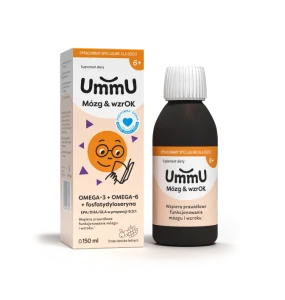Dzieci rosną tak szybko – ważne, by wspierać w nich to co najcenniejsze. UmmU Mózg & wzrOK6+ to preparat przeznaczony dla dzieci w okresie intensywnego rozwoju, który dzięki zawartości kwasów omega-3 wspomaga mózg i wzrok1 oraz serce2. Zawiera także fosfatydyloserynę – fosfolipid występujący licznie w komórkach nerwowych mózgu, gdzie wchodzi w skład błon komórkowych. Produkt posiada pozytywną opinię Centrum Zdrowia Dziecka.